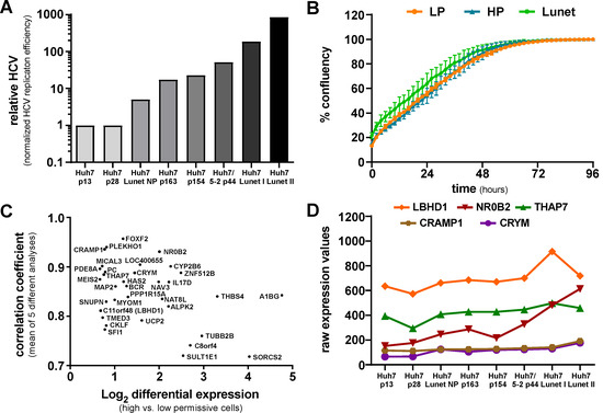 Gene expression profiling and statistical analysis revealed potential HCV permissiveness determining factors. (A) HCV (gt1b) replication efficiency differs up to 1000-fold in different passages and clones of the Huh7 cell line. This panel was adapted from [47]); “HCV replication efficiency” refers to the ratio of HCV reporter levels at 48 h to input levels at 4h, see methods. Data was normalized to the two lowly permissive passages Huh7-p13 and -p28. Data represents only one biological replicate measured in parallel to the preparation of total cellular RNA used for microarray experiments; variance across three replicate wells was negligible, hence error bars were omitted. (B) Huh7-LP (LP), -HP (HP), or -Lunet (Lunet) cells were seeded in 96-well plates and imaged every 2 h using the IncuCyte system. Data represents mean and standard deviation from four independent wells. (C) Correlation analyses of expression profiles and HCV replication efficiency across all eight different naïve Huh7 cell lines revealed 34 potential HCV host factors (see also Figure S1). (D) Raw expression data of the followed-up candidates in all eight tested different Huh7 cell lines.