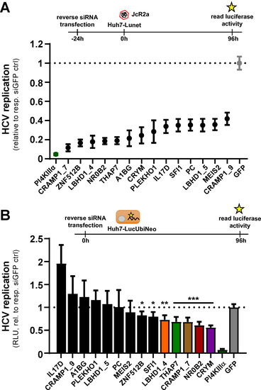 SiRNA-mediated knockdown of potential host factors reduced HCV replication in an infection (A) and replicon model (B) in highly permissive cells. (A) Huh7-Lunet cells were reverse transfected with siRNAs against the indicated genes for 24 h prior to infection with the Renilla luciferase reporter virus JcR2a (gt2a) for 72 h. Data is normalized to siRNA targeting GFP and shown are means and standard deviations from three independent biological experiments. (B) Huh7-LucUbiNeo cells (gt2a, subgenomic replicon) were reverse transfected with siRNA and luciferase activity was measured 96 h later. Data is normalized to siRNA targeting GFP and shown are means and standard deviations from two independent biological experiments. Statistical significance was calculated using two-tailed, non-paired Student’s t-test. * p ≤ 0.005, ** p ≤ 0.001, *** p ≤ 0.0001.