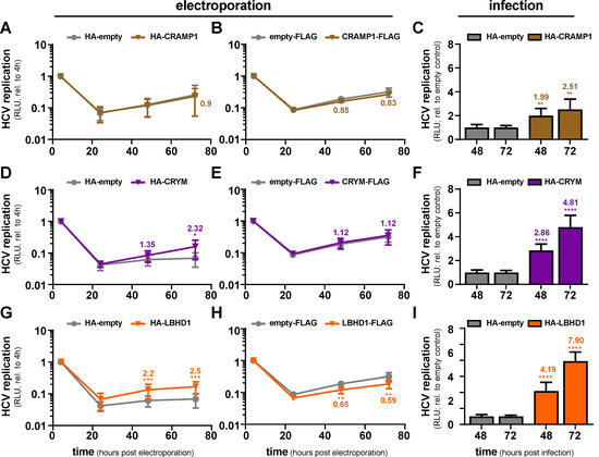 Overexpression of potential permissiveness determining factors in lowly permissive Huh7-LP cells. (A,B) Replication of a subgenomic HCV luciferase reporter replicon (gt1b) after electro-transfection into HA-CRYM (A) or CRYM-FLAG (B) overexpressing Huh7-LP cells compared to the respective empty vector control in a time-course of 72 h. (C) Expression levels of CRYM mRNA determined by qRT-PCR in CRYM-FLAG overexpressing Huh7-LP cells versus cells transduced with an empty-FLAG vector. (D,E) Replication of HCV in HA-LBHD1 (D) or LBHD1-FLAG (E) overexpressing Huh7-LP cells and (F) according expression levels of LBHD1. (G,H) Replication of HCV in HA-CRAMP1 (G) or CRAMP1-FLAG (H) overexpressing Huh7-LP cells and (I) according expression levels of CRAMP1. Luciferase data is normalized to the input signal four hours post electro-transfection and shows mean and standard deviation from at least three independent biological experiments. Significance was calculated using two-tailed, non-paired Student’s t test. * p ≤ 0.05, ** p ≤ 0.005, *** p ≤ 0.001, **** p ≤ 0.0001.
