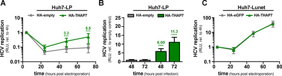 THAP7 is a limiting host factor for HCV replication in lowly but not in highly permissive Huh7 cells. (A) Replication of a subgenomic luciferase reporter replicon (gt1b) after electro-transfection into HA-THAP7 overexpressing Huh7-LP cells compared to an HA-empty vector control in a time-course of 72 h. (B) Full-length Renilla luciferase reporter virus (JcR2a) replication in HA-THAP7 overexpressing Huh7-LP cells compared to an HA-empty vector control after 48 and 72 h. (C) Replication of a subgenomic luciferase reporter replicon (gt1b) after electro-transfection into HA-THAP7 overexpressing Huh7-Lunet cells. HCV replication in (A,C) was normalized to the input signal four hours post transfection and (A–C) show mean and standard deviation from at least three independent biological experiments. Significance was calculated using two-tailed, non-paired Student’s t-test. *** p ≤ 0.001, **** p ≤ 0.0001.