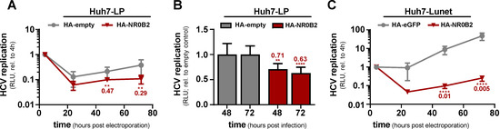 NR0B2 overexpression inhibits HCV replication in lowly and highly permissive Huh7 cells. (A) Replication of a subgenomic luciferase reporter replicon (gt1b) after electro-transfection into HA-NR0B2 overexpressing Huh7-LP cells compared to an HA-empty vector control in a time-course of 72 h. (B) Full-length Renilla luciferase reporter virus (JcR2a) replication in HA-NR0B2 overexpressing Huh7-LP cells compared to an HA-empty vector control after 48 and 72 h. (C) Replication of a subgenomic luciferase reporter replicon (gt1b) after electro-transfection into HA-NR0B2 overexpressing Huh7-Lunet cells compared to an HA-eGFP vector control in a time-course of 72 h. Luciferase data (A,C) is normalized to the signal four hours post electro-transfection and (A–C) show mean and standard deviation from at least three independent biological experiments. Significance was calculated using two-tailed, non-paired Student’s t-test. ** p ≤ 0.005, **** p ≤ 0.0001.