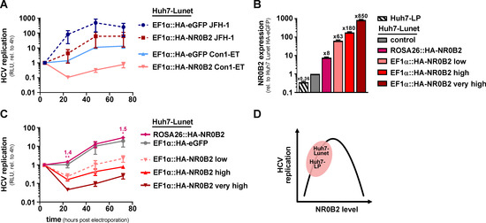 NR0B2 expression levels determine HCV replication efficiency independent of the genotype. (A) Replication of subgenomic luciferase reporter replicons of gt2a (JFH-1) or gt1b (Con1-ET) after electro-transfection into Huh7-Lunet overexpressing HA-NR0B2 compared to an HA-eGFP expressing control in a time-course of 72 h. (B) Expression levels of Huh7-Lunet cells expressing different amounts of HA-NR0B2 compared to an HA-eGFP expressing control cell line by qRT-PCR. (C) Replication of a subgenomic luciferase reporter replicon (gt1b) after electro-transfection into Huh7-Lunet cells expressing different amounts of HA-NR0B2 compared to an HA-eGFP control in a time-course of 72 h. (D) Proposed model of the correlation between NR0B2 levels and HCV replication efficiency in Huh7-Lunet and -LP cells. Luciferase data (A,C) is normalized to the input signal four hours post transfection and shows mean and standard deviation from at least three independent biological experiments. Significance was calculated using two-tailed, non-paired Student’s t-test. * p ≤ 0.05, ** p ≤ 0.005.