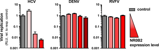 NR0B2 specifically affects HCV replication. Huh7-Lunet cells overexpressing different levels of NR0B2 (see Figure 6B) were infected with HCV, DENV, or RVFV luciferase reporter viruses, respectively. Luciferase activity was measured after 72 h for HCV and 48 h for DENV and RVFV, respectively. Note the logarithmic y-axis.