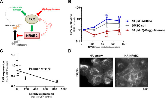 NR0B2 (also known as SHP) is a well-established downstream effector of farnesoid X receptor FXR (NR1H4) signaling (Figure 8A), and it has previously been shown that bile acids can increase replication of HCV in an FXR-dependent manner [76,77,78]. Additionally, in our hands, activation of FXR with its agonist GW4064 and inhibition by the antagonist (Z)-Guggulsterone led to an increase and decrease in HCV replication, respectively (Figure 8B). We hypothesized that activation of FXR might emulate our slight overexpression of ROSA26:NR0B2 in Huh7-Lunet cells. It appears feasible that the negative effect of NR0B2 overexpression is mediated via regulation of FXR. Although there is no reported evidence for a direct transcriptional regulation of FXR by NR0B2, we observed a negative correlation between FXR and NR0B2 mRNA levels in our overexpressing cell lines (Pearson coefficient −0.79; Figure 8C). While this might indeed explain the inhibitory effect on HCV replication, it might rather be the indirect consequence of blocked bile acid synthesis by high levels of NR0B2 (Figure 8A, [79,80]). In support of this notion, we found less than 50% of total bile acids in cell lysates from Huh7-Lunet cells overexpressing HA-NR0B2 compared to the HA-eGFP control (Figure S8); however, absolute levels of bile acids were at the lower limit of detection even for the control cells. On the other hand, NR0B2 regulates bile acid anabolism by transcriptional inhibition of the cholesterol-hydroxylase CYP7A1 and cholesterol is known to play a crucial role in the HCV life cycle as well [21]. Thus, we also examined the distribution of free cholesterol in the cell using Filipin-III [81]. In contrast to a very defined, speckled ER-like localization of cholesterol in control cells, NR0B2 overexpression led to substantial relocalization of cholesterol away from the perinuclear region towards the plasma membrane of the cell (Figure 8D). These findings suggest that a finely balanced expression of NR0B2 might be required for maintaining sufficient levels of cholesterol at the sites of replication of HCV.