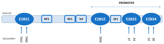 Epigenetic modifications have been proposed as another possible mechanism for E2 inactivation [28,29,30]. CpG methylation at the repressive E2BSs may disable E2 binding and prevent its repressive function on E6/E7 oncogene transcription. The methylation levels of the E2BS1, -3 and -4 were found to be higher in CC with extrachromosomal compared to integrated HPV genomes [28]. This phenomenon has also been observed for the repressive E2BSs in HPV-driven oropharyngeal cancers [31]. Another possible mechanism of disrupting the negative feedback of E2 in E6/E7 transcription could be mutations in the repressive E2BS3 or E2BS4 that make this regulation ineffective.