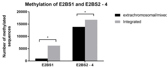 CpG methylation levels of activating E2BS1 and repressive E2BS2-4. Numbers of methylated sequences were compared between samples with extrachromosomal/mixed or integrated viral genomes both for activating E2BS1 and repressive E2BS2-4. The difference was statistically significant for both areas (p = 0.028 for E2BS1 and p = 0.034 for E2BS2-4).