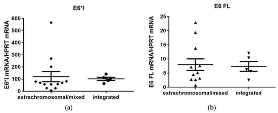 We observed no statistically significant difference in the viral load between the extrachromosomal/mixed and integrated genome status. The viral load was slightly, although not significantly, higher in samples with the extrachromosomal/mixed genome form. Similar data were reported by researchers examining CC [19,45,46] or HNC [16,46,47], but other studies did not find any differences in the viral loads [19,23]. When comparing the levels of expression of E6 transcripts, the E6*I transcript was more abundant than the E6 FL transcript. No increase of E6/E7 mRNA was observed in those samples with the integrated HPV genome without E2 mRNA, which is in agreement with the results of other studies on CC and HNC cancer [23,24,47]. Increasing levels of the E6/E7 transcripts were detected in premalignant cervical lesions, with the highest level being reported in invasive cancers [48], and this level seems not to be influenced by other factors, and to be sufficient for the maintenance of the malignant phenotype.