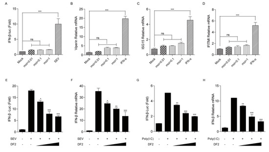 (A) CRFK cells were transfected with interferon-β (IFN-β) promoter luciferase reporter plasmid, along with pRL-TK. At 24 hpi, the cells were either mock-infected or infected with increasing concentrations of feline infectious peritonitis virus (FIPV)-DF2 (moi = 0.01, 0.1, 1). The mock-infected cells were infected with 20 hemagglutinating activity units of Sendai virus (SEV) as a positive control. At 12 hpi, the cells were lysed and luciferase assays were performed. (B–D) CRFK cells were mock-infected or infected with increasing concentrations of FIPV-DF2 (moi = 0.01, 0.1, 1) for 12 h. CRFK cells were treated with IFN-α (500 ng/mL) as a positive control, and the levels of Viperin (B), interferon-stimulated gene (ISG)15 (C), and IFITMI (D) mRNA were detected by qRT-PCR. (E,G) CRFK cells were co-transfected with IFN-β promoter luciferase reporter plasmid and pRL-TK for 24 h, followed by mock-infection or infection with increasing concentrations of DF2 (moi = 0.01, 0.1, 1) for 12 h and then infection with 20 hemagglutinating activity units of SEV (E) or transfection with poly(I:C) (2 μg/mL) (G); the cells were lysed and luciferase assays were performed. (F,H) CRFK cells were mock-infected or infected with increasing concentrations of DF2 (moi = 0.01, 0.1, 1) for 12 h and then infected with 20 hemagglutinating activity units of SEV (F) or transfected with poly(I:C) (2 μg/mL) (H); the levels of IFN-β mRNA were detected by qRT-PCR. The data shown represent the means ± SD, and all experiments were repeated three times. The significant differences are indicated as follows: * p < 0.05, ** p < 0.01, *** p < 0.001.