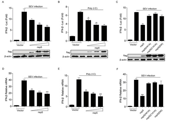(A,B) HEK293T cells were co-transfected with IFN-β promoter reporter plasmid and pRL-TK, along with increasing amounts of FIPV-nsp5 (200 ng, 400 ng, 800 ng). At 24 hpi, the cells were infected with 20 hemagglutinating activity units of SEV (A) or transfected with poly(I:C) (2 μg/mL) (B). At 20 hpi, the cells were collected and the luciferase activities were measured. The expression levels of indicated proteins were analyzed by Western blot. (C) HEK293T cells were transfected with IFN-β promoter reporter plasmid and pRL-TK, in combination with a vector expressing the wild-type nsp5, the nsp5 single mutation (H41A, C144A), or nsp5 double mutation (DM) (800 ng), followed by mock infection or SEV infection. At 20 hpi, cell lysates were prepared and the luciferase activities were measured. The expression levels of indicated proteins were analyzed by Western blot. (D,E) HEK293T cells were transfected with increasing amounts of FIPV nsp5 (200 ng, 400 ng, 800 ng)-expressing plasmid for 24 h and then infected with 20 hemagglutinating activity units of SEV (D) or transfected with poly(I:C) (2 μg/mL) (E). At 20 hpi, the cells were collected and the mRNA levels of IFN-β were evaluated by qRT-PCR. (F) HEK293T cells were transfected with FIPV nsp5 or nsp5 mutants (800 ng) followed by mock infection or SEV infection. At 20 hpi, the cells were collected and the mRNA levels of IFN-β were evaluated by qRT-PCR. The data shown represent the means ± SD, and all experiments were repeated three times. The significant differences are indicated as follows: * p < 0.05, ** p < 0.01, *** p < 0.001.