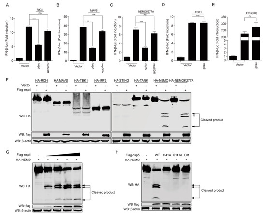 3.5. FIPV nsp5-Mediated NEMO Cleavage Is Involved in the Suppression of IFN-β Induction