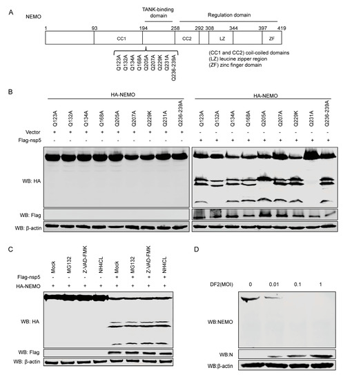 NEMO is an essential component of the IKK complex which contains many distinct domains, including a TANK-binding domain [30], two coil–coiled domains (CC1 and CC2), a leucine zipper region, and a zinc finger domain [32]. Previous studies demonstrated that CoV nsp5 preferentially cleaved glutamine (Gln) at the P1 position [42,43]. In the experiment described above, co-expression of FIPV nsp5 and feline NEMO resulted in the appearance of three N-terminal fragments. Two of them had molecular masses of approximately between 25 and 35kDa, while a smaller new band had a molecular mass of approximately 20 kDa. According to these data, we speculated the amino acid sequence of NEMO for potential FIPV nsp5 cleavage sites which could be able to produce fragments of the appropriate size mentioned above. We inferred that potential FIPV nsp5 cleavage sites existed at amino acids 123–240 within feline NEMO. To examine FIPV nsp5 cleavage sites, we constructed a series of NEMO mutants in which glutamine (Gln) at the P1 position was replaced with alanine or arginine (Figure 4A). HEK293T cells were transfected with NEMO or NEMO mutation, in combination with the expressing plasmid nsp5. As shown in Figure 4B, we observed that at least one cleaved fragment was absent in the NEMOQ132A, NEMOQ205A, or NEMOQ231A/FIPV nsp5 co-expression samples; in contrast, FIPV nsp5-mediated NEMO cleavage was not affected by Q123A, Q134A, Q168A, Q207A, Q229R, or Q236–239A. We further investigated whether cellular caspase activity or proteasome or lysosome signaling are required for FIPV nsp5-mediated NEMO cleavage. HEK293T cells expressing NEMO and nsp5 were treated with a pan-caspase inhibitor (Z-VAD-FMK), proteasome inhibitor (MG132), or lysosome inhibitor (NH4CL), respectively. The results showed that none of the three inhibitors prevented FIPV nsp5-mediated NEMO cleavage (Figure 4C). Moreover, to test whether endogenous NEMO was cleaved during FIPV-DF2 infection, CRFK cells were either mock-infected or infected with increasing concentrations of DF2, and the levels of endogenous NEMO were investigated. As shown in Figure 4D, upon infection with increasing concentrations of DF2, the levels of endogenous NEMO decreased in a dose-dependent manner compared with mock-infected cells.