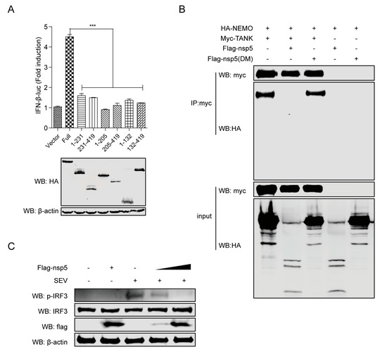 (A) HEK293T cells were co-transfected with IFN-β-luc and pRL-TK, in combination with flag-tagged NEMOK277A (full) expression plasmid or NEMOK277A deletion mutants (NEMOK277A-1-205, NEMOK277A-205-419, NEMOK277A-1-231, NEMOK277A-231-419) (800 ng). Luciferase assays were performed at 30 h after the transfection. The expression levels of indicated proteins were analyzed by western blot. (B) HEK293T cells were transfected with a plasmid expressing HA-tagged NEMO (1 μg), along with a plasmid expressing Myc-tagged TANK or a vector plasmid (1 μg) and in combination with a plasmid expressing flag-tagged nsp5 or flag-tagged nsp5DM (2 μg). The cell lysates were immunoprecipitated with anti-Myc antibody. The cell lysates and the immunoprecipitants were analyzed by immunoblotting using anti-HA (1:3000) or anti-Myc antibodies (1:3000). (C) CRFK cells were transfected with increasing amounts of nsp5-expressing plasmids (0, 1.5 and 3 μg) for 24 h and then infected or not with SEV for another 20 h, and the lysates were then subjected to immunoblotting with anti-phospho-IRF3 (1:100), anti-IRF3 (1:100), anti-Flag (1:3000), and anti-β-actin (1:3000) antibodies. The data shown represent the means ± SD, and all experiments were repeated three times. The significant differences are indicated as follows: *** p < 0.001.