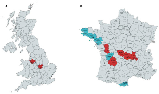 Maps of the UK (A) and France (B) illustrating the regions that the field vole paramyxovirus (A) and rabbit rotavirus A (B) were detected, along with their frequency. (A) Cheshire and Leicestershire (highlighted in red) had four and one positive field voles with paramyxovirus. (B) The departments Creuse, Puy-de-Dôme, Deux-Sèvres, Loire and Dordogne (highlighted in red) had six, four, one, one and one positives, respectively. The departments Charente, Finistère, Morbihan, Loire Atlantique and Pyrénées Orientales had no positives.
