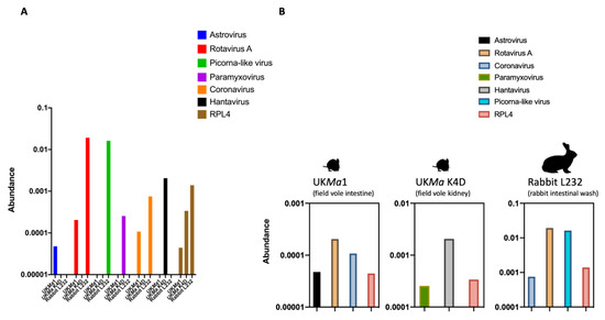 Overview of viral reads identified in this study. (A) Host associations (UK Microtus agrestis gut (UKMa1), UKMa K4D and rabbit L232) with the viral reads identified in this study: astrovirus, rotavirus A, picorna-like virus, paramyxovirus, coronavirus, hantavirus and host reference gene ribosomal protein L4 (RPL4). (B) Individual representation of the abundance of viral reads in each animal sample, measured as a percentage of viral reads in log10 scale.