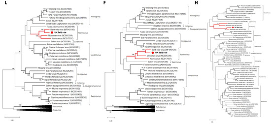 Phylogenetic relationships of the field vole paramyxovirus based on the L, F and H genes. The trees represent maximum likelihood phylogenetic analyses of paramyxovirus partial L (910 aa), F (242 aa) and H (205 aa) gene sequences, revealing that the rodent narmoviruses form a single clade within the Paramyxoviridae. The novel sequence obtained from the UK field vole UKMa K4D was analyzed alongside reference sequences representing a diverse set of paramyxoviruses. Reference sequences are indicated by their GenBank accession numbers. Branch lengths are drawn to a scale of amino acid substitutions per site. Numbers above individual branches indicate bootstrap support; only values >80% are shown. Narmoviruses are highlighted in red and the novel UK field vole paramyxovirus is marked with a red dot. For clarity, some large viral clades have been collapsed.