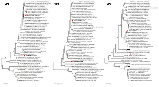 Phylogenetic relationships of the field vole and the rabbit rotavirus A based on the VP1, VP2 and VP3 segment. The trees represent maximum likelihood phylogenetic analyses of rotavirus A partial VP1 (648 aa), VP2 (329 aa) and VP3 (791 aa) segment sequences. The novel sequences obtained from the UK field vole UKMa1 and the French rabbit L232 were analyzed alongside reference sequences representing rotaviruses A from different host species. Reference sequences are indicated by their GenBank accession numbers. Branch lengths are drawn to a scale of amino acid substitutions per site. Numbers above individual branches indicate bootstrap support; only values >80% are shown. The novel rotaviruses A are marked with a red dot. For clarity, some viral clades have been collapsed.