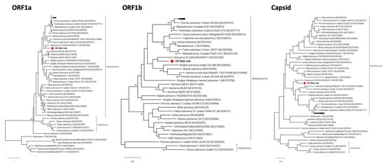 Phylogenetic relationships of the novel field vole astrovirus based on the ORF1a, ORF1b and capsid genes. The trees represent maximum likelihood phylogenetic analyses of astrovirus partial ORF1a (508 aa), ORF1b (298 aa) and capsid (350 aa) gene sequences. The novel sequence obtained from the UK field vole UKMa1 was analyzed alongside reference sequences representing all different genera of astroviruses. Reference sequences are indicated by their GenBank accession numbers. Branch lengths are drawn to a scale of amino acid substitutions per site. Numbers above individual branches indicate the bootstrap support; only values >80% are shown. The novel UKMa1 astrovirus is marked with a red dot. For clarity, some viral clades have been collapsed.