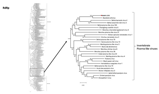 Two contigs of a novel picorna-like virus were retrieved from the intestine of the French rabbit L232 with a total of 5642 nt (4752 nt and 890 nt) (Table 1). A blastX analysis revealed that in the NTPase, 3C peptidase, RNA-dependent-RNA-polymerase (RdRp) and capsid proteins the novel rabbit picorna-like virus was only 44%, 52%, 61% and 34% similar at the amino acid level to their closest relative (Blackbird arilivirus) (NC040820) (Table 2). Phylogenetic analysis revealed that the virus clustered with the Blackbird arilivirus with 100% bootstrap support (Figure 6). Surprisingly, both viruses clustered within the invertebrate picorna-like viruses, suggesting that they might have in fact been derived from a dietary component.