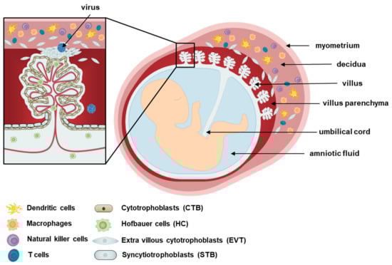 Current laboratory methods for determining viral infections during pregnancy rely on serology, which measures levels of IgM and IgG, and virus detection, including virus isolation, and molecular assays for the detection of viral nucleic acid [85]. However, greater efforts are needed to help pregnant women and newborns to avoid the risk of infections and their consequences. The ability of the previously mentioned pathogens to cross the placental barrier and ultimately infect the developing fetus highlights the need to identify the mechanism underlying maternal–fetal transmission. Findings from previous studies emphasize the important role of fetal placental cells as possible reservoirs and conduit for pathogens at the maternal–fetal interface. Unfortunately, the exact mechanisms underlying viral infections in the placenta remain to be identified. Further studies on vertical transmission of pathogens, and investigation of the interactions between the viruses and the host at the placenta, in particular, are crucial for the discovery and development of vaccines and therapies to prevent and treat congenital infections.