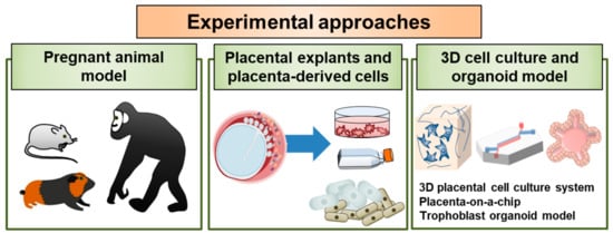 The study of early human placental development is hampered by practical and ethical issues, and both animal and in vitro cell culture models are routinely used to study the essential functions of the placenta. In particular, choriocarcinoma-derived cell lines such as BeWo, Jar, and Jeg-3, can be alternatives for and complementary to the primary cell models as in vitro models for placental research. Given the significant spatiotemporal differences in early placental development in rodents and humans, it is important to develop new experimental approaches to study host–pathogen interactions at the maternal–fetal interface during pregnancy. It is also critical for us to elucidate the pathways and defense mechanisms associated with viral infection during pregnancy and further develop effective and safe vaccines. In the following sections, we have summarized current experimental models that can be used to study placental pathogenesis and discuss emerging opportunities to enhance our understanding of the crosstalk between the maternal and fetal compartments (Figure 2).
