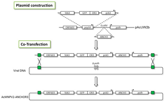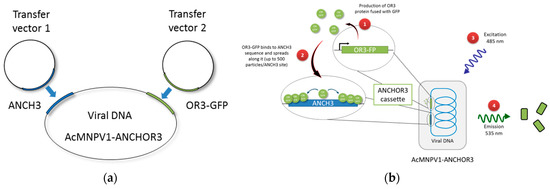 AcMNPV1–ANCHOR3 was constructed by inserting the two components of the system via homologous recombination between the parental virus DNA and the two transfer vectors pGmAc116T-ANCH3 and pVT/gp37-OR3. These inserts were placed in the baculovirus genome at the polh and at the gp37 genes (Ac ORF 64), respectively [22] (Figure 2).