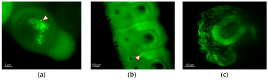 Visualization of recombinant virus infection by fluorescence microscopy using a Zeiss Axiovert Observer Z1 in (a) S. frugiperda living cells at 18 hp.i. Arrow shows individual OBs (Sf9), (b) Alive S. exigua larva at 48 hp.i. Arrow shows tracheal epitheium infectedand (c) cross-section reconstruction of larva showing midgut infection at 48 h.pi.