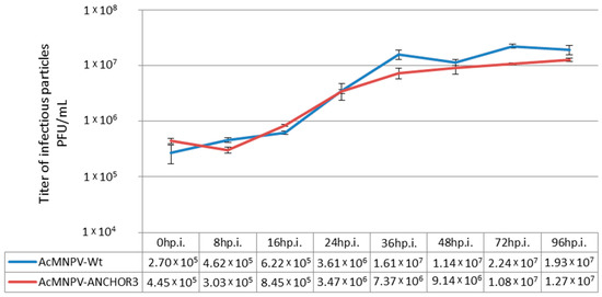 One step growth curve of Wildtype (Wt) and recombinant AcMNPV1–ANCHOR3 virus. The titers correspond to the average of three independent titrations.