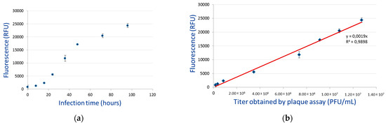 In order to determine the link between RFU of AcMNPV1–ANCHOR3 and the viral concentration, RFU were plotted versus virus titers obtained by plaque assay (Figure 7b). A correlation of R2 = 0.98 was obtained. This linearity indicates that the fluorimetric reading can be utilized as a quantitative method. The limit of detection (LoD) of the fluorimetric reading method was around 50 BVs, while 1 BV could be identified by microscopy.