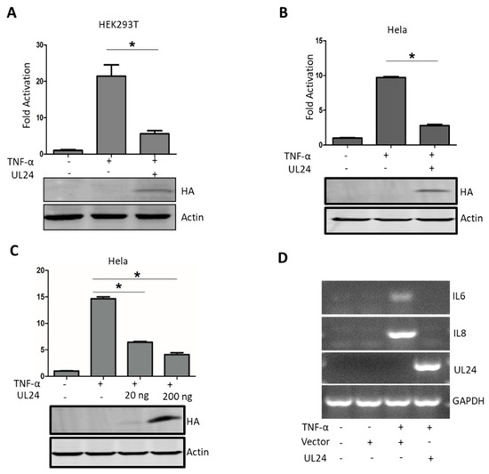 TNF-α is a multifunctional pro-inflammatory cytokine involved in protecting the host from pathogen infections by induction and regulation of host innate and adaptive immune responses [35]. TNF-α regulates host innate and adaptive immune responses mainly by the NF-κB pathway; it first binds to its receptor and subsequently recruits corresponding adaptors, finally activating NF-κB [36]. In this study, we used TNF-α as a stimulator to test whether UL24 plays a role in TNF-α-mediated NF-κB activation. As shown in Figure 1A, TNF-α significantly promoted NF-κB reporter gene expression, and UL24 significantly attenuated TNF-α-mediated NF-κB activation in HEK293T cells (Figure 1A). We next evaluated whether UL24 blocks NF-κB activation in HeLa cells. We got a similar result as in HEK293T cells (Figure 1B). Furthermore, we found that this attenuation was dose dependent (Figure 1C). IL-6 and IL-8 mRNA were downstream of NF-κB, so we next evaluated whether UL24 influences the expression of IL-6 and IL-8. The result demonstrated that UL24 expression significantly downregulated IL-6 and IL-8 (Figure 1D). These data indicated that UL24 overexpression significantly reduced TNF-α-mediated NF-κB activation.