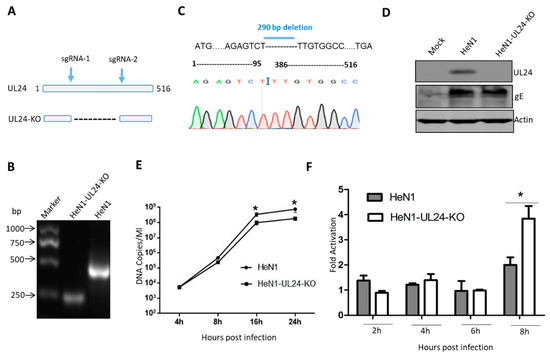 Deletion of UL24 promotes NF-κB activation. (A) Diagram of the PRV UL24 gene, with the sgRNA1 and sgRNA2 incision positions. (B) The UL24 knockout virus was identified by PCR. Several clones were randomly chosen and cultured in Vero cells, and the virus genome was extracted and identified by PCR with the primers. (C) UL24 knockout was confirmed by DNA sequencing; 290 bases were deleted from 96~385 bp of the UL24 gene. The deletion region is shown as a dotted line. (D) UL24 knockout was confirmed by Western blot. (E) The HEK293 cells were inoculated with WT PRV or UL24 knockout PRV at a multiple of infection (MOI) of 0.1. The virus was collected at 4, 8, 16, and 24 h post infection. qPCR was used to quantify the copy numbers of viral DNA. (F) HEK293T cells were transfected with an NF-κB-Luc reporter plasmid. Twelve hours later, the cells were infected with HeN1 PRV or UL24 knockout PRV (MOI = 10), and luciferase activity was measured at 2 h, 4 h, 6 h, and 8 h post infection. The experiments were performed three times, and a representative result is shown. * indicates p < 0.05.
