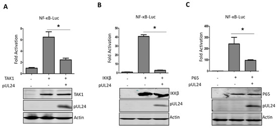 Next, we further explored which step(s) in the NF-κB signaling pathway was/were abrogated by UL24. TNF-α activates NF-κB by first binding to its receptor, resulting in recruitment of the adaptor protein TNF receptor death domain (TRADD), TNFR-associated factor 2 (TRAF2), and receptor-interacting protein 1 (RIP1), and then activates TGF-activated kinase 1 (TAK1) to further activate NF-κB [36]. TAK1 is one of the most important regulatory components in the NF-κB signaling pathway [37], so we first determined whether the UL24 targeting site was upstream or downstream of TAK1. As shown in Figure 3A, UL24 significantly inhibited TAK1-induced NF-κB activation. Next, we further tested the targeting site at the IκB kinase beta (IKKβ) or P65 level. The results demonstrated that UL24 inhibited NF-κB activation induced by IKKβ or P65, indicating that the UL24 targeting site was at or downstream of P65 (Figure 3B,C).
