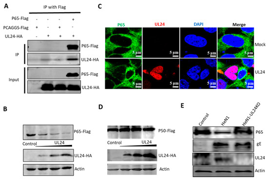 UL24 interacts with p65 and leads to its degradation. (A) HEK293T cells were co-transfected with a p65-Flag expression plasmid and a UL24-HA expression plasmid for 48 h. The cells were lysed, and the extracts were processed for immunoprecipitation with an anti-Flag antibody. Precipitated proteins and whole-cell lysates were probed with antibodies against HA and Flag. (B) HEK293T cells were co-transfected with increasing amounts of the UL24 plasmid (0, 0.5, 1, and 2 μg) and 2 μg of the p65 plasmid; the cells were lysed at 48 h post transfection, and the expression of p65 was detected by WB. (C) HEK293T cells were transfected with 2 μg of UL24-HA expression plasmid. At 48 h post transfection, the P65 status of the cells was detected by immunofluorescence, scale bar was 5 μm. (D) HEK293T cells were co-transfected with increasing amounts of the UL24 plasmid (0, 0.5, 1, and 2 μg) and 2 μg of the p50 plasmid; the cells were detected by WB. (E) HEK293T cells were infected with wild-type PRV or UL24 knockout PRV at an MOI of 0.01 for 48 h. The cells were lysed, and the extracts were subjected to WB. The experiment was performed three times, and a representative result is shown.