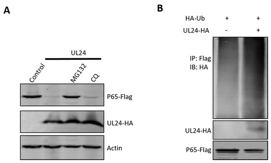 For intracellular protein degradation, there are two major pathways: the ubiquitin–proteasome-dependent pathway and the lysosome-dependent pathway. To determine if these two pathways are involved in UL24-mediated P65 degradation, MG132 (ubiquitin–proteasome inhibitor) and chloroquine (CQ, lysosome pathway inhibitor) were added to HEK293T cells co-expressing UL24 and P65. The Western blot (WB) results shown in Figure 4 indicate that the ubiquitin–proteasome inhibitor MG132 reversed the expression of P65 and that CQ did not. This result indicated that UL24 degrades P65 via the proteasome pathway. Proteins degraded via the proteasome pathway must be ubiquitinated first. The above data demonstrated that UL24 interacted well with P65; we next tested whether UL24 affects P65 ubiquitination. The ubiquitination assay showed that UL24 could increase P65 polyubiquitination (Figure 5B).