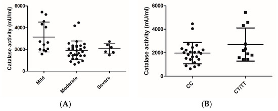 A measurement of catalase activity in NPS samples showed that the patients in the group with the moderate or severe LRT RSV disease had significant lower catalase activity compared to those in the mild group (Figure 1A). A comparison of catalase activity in NPS of infants with RSV LRTI according to the presence of the rs1001179 CC or CT/TT alleles showed a trend towards higher activity in the CT/TT group; however, this did not reach statistical significance (p < 0.07).