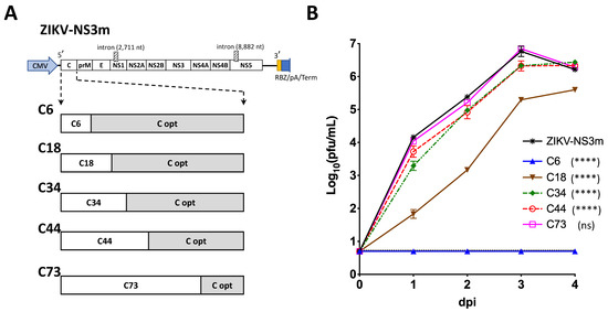 Mapping the region containing regulatory elements of the C gene of ZIKV. (A) Schematic representation of ZIKV-NS3m infectious clone (on top of (A)), which was used to construct a panel of viruses with chimeric C gene sequence (on the bottom of (A)). White boxes represent wt sequence of ZIKV-NS3m. Gray boxes (C opt) represent sequences that were mutated by synonymous substitutions. (B) Growth kinetics of viruses with chimeric C gene sequence in Vero cells after plasmid DNA transfection. Mean viral titer ± standard deviations in the samples that were collected daily from duplicate flasks were determined by titration in Vero cells. Dotted line (the one right above the blue C6 line) represents limit of virus detection (0.7 log10 pfu/mL). Differences between growth of ZIKV-NS3m and that of the other constructs were compared using two-way ANOVA (**** p < 0.0001; ns—not significant, p > 0.05).