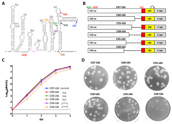 Identification of a minimal region of C gene that is required for ZIKV growth in Vero cells by deletional analysis. (A) Predicted stem-loop structure of the 5′-end of ZIKV genome (strain Paraiba_01/2015). Colored arrows indicate codon positions at which 5′ terminus of wt C gene sequences were fused with target sequence for mir-124 (red box in panel B). Sequence highlighted in green indicates translation initiation codon AUG of ZIKV polyprotein. Sequence highlighted in magenta indicates 5′ genome cyclization sequence. +1 (A) shows the position of ORF-shifting insertion (+1 nt) of a single A residue. (B) Schematic representation of viral genomes featuring gradual reduction of the wt C gene sequence from the 3′-end. Red and yellow boxes indicate target for mir-124-3p and ubiquitin gene, respectively. Gray boxes (C opt) represent full-length sequences of C gene that were mutated by synonymous substitutions. (+1 A) and (-1nt) are positions of ORF shifting and ORF restoring sequence modifications, respectively. Dotted arrow represents the site of cleavage by ubiquitin. (C) Growth kinetics of viruses in Vero cells after plasmid DNA transfection. Differences between growth kinetics of C67-Ubi (mean virus titers for dpi 1–4) and those of the other five viruses depicted in panel B were compared using two-way ANOVA (**** p < 0.0001; ns—denotes not significant, p > 0.05). Dotted line represents limit of virus detection (0.7 log10 pfu/mL). (D) Plaque morphology of viruses in Vero cell monolayer. Infected cells in 24-well plates were fixed at 5 dpi, and viral plaques were visualized by crystal violet staining.