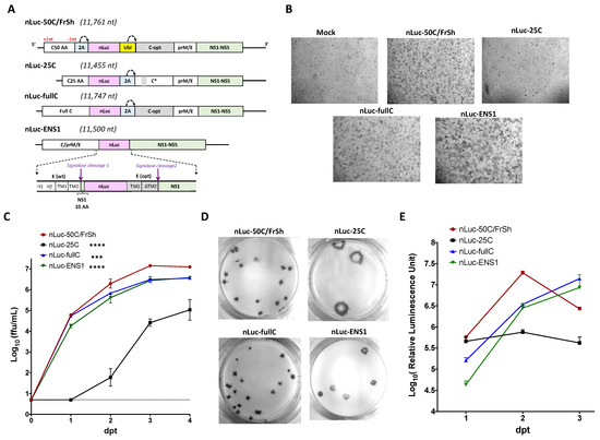 To compare kinetics of nLuc expression, Vero cells in 24-well plate were transfected with plasmid DNAs encoding each of the four nLuc-carrying viruses. The nLuc activity was measured daily in Vero cell lysates from the duplicate wells. Cell transfected with nLuc-50C/FrSh construct demonstrated fastest kinetics of nLuc accumulation, reaching maximum nLuc expression one day earlier compared to nLuc-fullC and nLuc-ENS1viruses (Figure 3E). Following plasmid DNA transfection with viral constructs, the nLuc gene can be translated from two distinct mRNAs: 1—the mRNA transcribed directly from the transfected plasmid in the nucleus from CMV promoter; and 2—from positive sense genomic RNA, which was synthesized in the cytoplasm by viral polymerase complex during viral replication. The absence of detectable increase in nLuc activity after 1 dpt for nLuc-25C virus (Figure 3E) strongly suggested that nLuc was translated from CMV promoter-derived mRNA rather than from viral RNA synthesized in the cytoplasm.