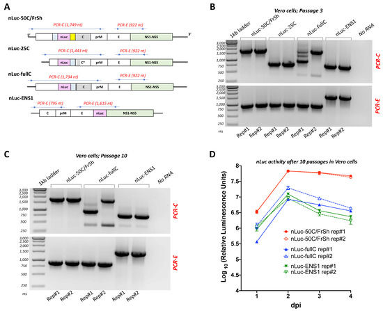 Since approaches for heterologous gene expression that preserve either the whole C or the first 25 aa of C gene at 5′ end of the genome demonstrated a high tendency for genetic instability, they were excluded from further characterization. In contrast, both nLuc-ENS1 and nLuc-50C/FrSh viruses remained stable in Vero cells (Figure 4) for ten passages and were chosen for subsequent analysis.