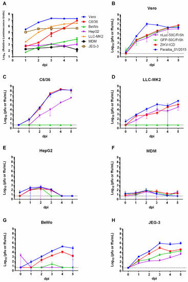 Characterization of reporter-carrying viruses in different cell lines. (A) Various cell lines of primate, human, and mosquito origin and human primary monocyte derived macrophages (MDM) were infected with nLuc-50C/FrSh in duplicates at an MOI of 0.01 in 24-well plates. Luciferase activity in cell lysates was measured daily for five days. (B–H) Growth kinetics of nLuc-50C/FrSh, GFPc-50C/FrSh, parental Paraiba_01/2015, and recombinant ZIKV-ICD viruses (colors representing each virus are defined in panel B) in Vero (B), C6/36 (C), LLC-MK2 (D), HepG2 (E), MDM (F), BeWo (G), JEG-3 (H). Cells were infected with each virus at a MOI of 0.01 in 12.5 cm2 flasks in duplicates. Aliquots were taken every day for five days after infection, and FFA or PFA was performed to determine virus titers. Results are presented as mean values of two biological replicates with SD shown as error bars. Dotted line represents limit of detection of the assay (0.7 Log10(pfu or ffu/mL)).