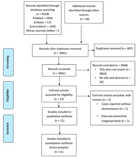 We have accessed a total of 3961 research articles from PubMed, Embase, ScienceDirect, African Journals Online and other sources after duplicates were removed. Of these, 3948 were removed after reading the titles and abstracts of the articles; the reasons being the titles did not match our interest (3854 articles), some articles lacked title and abstract (33 articles) and abstract did not contain required data (61 articles). Full texts of the remaining 13 research articles were critically reviewed and assessed for their quality using the JBI quality appraisal checklist for prevalence studies (Figure 1). Eleven out of 13 full-length articles were included in the systematic review and meta-analysis. Two of the articles were excluded after reading the full-length article; one article was excluded because of reporting the cases without denominators and the other presented the data inappropriately (Figure 1). One of the research articles included for analysis contained information on the prevalence of childhood rotavirus infections in pre- and post-vaccination periods. As a result, it was treated as two separate studies considering the pre-vaccination and post-vaccination data as a separate article. The rest of the studies reported either the pre-vaccination or the post-vaccination data. Finally, we used 12 articles to estimate the pooled prevalence of rotavirus infection among under-five years of age children in Ethiopia. Among the 12 articles only five reported on the genotype distribution of rotavirus infection.