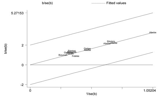Galbraith plot. Authors’ name represents individual studies. The y-axis represents standard error of the estimates. The x-axis represents the reciprocal of the standard error. In this figure, the weighted estimates of individual studies represented by the authors’ name lie between the ±2 standard error of the pooled estimate. This subjective assessment indicates the absence of heterogeneity between individual studies.