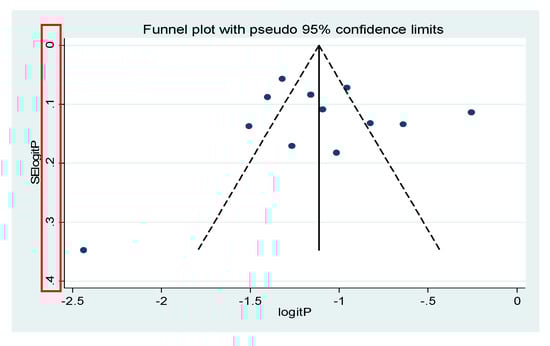 Funnel plot. Each dot represents individual studies. The y-axis represents standard error of estimate. The x-axis represents logit transformed estimates. The subjective assessment of this funnel plot looks asymmetrical which is an indication of heterogeneity of individual studies.