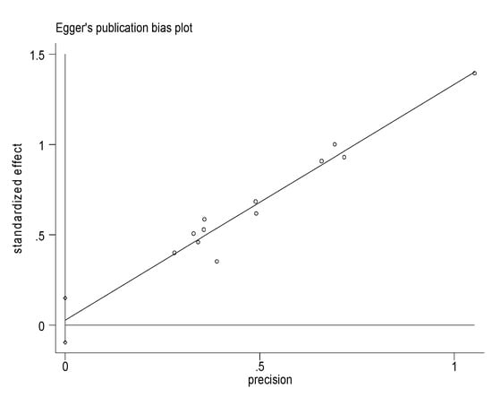 Eggers Publication bias plot. Each dot represents individual studies. The x-axis represents precision (reciprocal of the standard error of the estimate). The y-axis represents standardized effect (estimate divided by its standard error). The subjective assessment was that the y-intercept is closer to the origin (0) which is an indication for the absence of publication bias. This subjective assessment was also supported by the objective Eggers test in the table below which showed the absence of significant publication bias (p = 0.619) (Table 2).