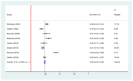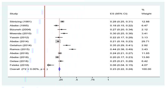 The prevalence of rotavirus infection among children with acute gastroenteritis in Ethiopia ranged from 8.04% in a community-based study in Amhara regional state to 43.63% in a health facility-based study in Oromia regional state. The pooled prevalence of rotavirus infection among under-five children with acute gastroenteritis was 23% (95% CI = 22%, 24%) (Figure 5).