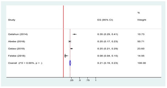Forest plot of pooled prevalence estimates of rotavirus infection after the introduction of rotavirus vaccine among under-five children with acute gastroenteritis in Ethiopia, 2019 [18,19,21,22]. The red line represents the minimum possible prevalence value (0). The dashed line represents the mean pooled rotavirus prevalence estimate. The black dot at the center of the gray box represents the point prevalence estimate of each study and the line indicates the 95% confidence interval of the estimates. The gray box represents the weight of each study contributing to the pooled prevalence estimate. The blue diamond represents the 95% confidence interval of the pooled rotavirus prevalence estimate.