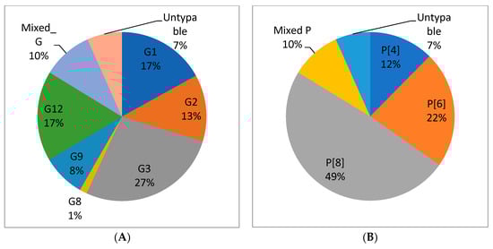 Rotaviruses are triple-layered particles containing 11 segments of genomic double-stranded RNA that belong to the Reoviridae family. The virus encodes six structural proteins (VP1–VP4, VP6 and VP7) and six non-structural proteins (NSP1–NSP6) [5]. Rotaviruses are classified into different P and G-types based on the genetic characteristics of their VP4 and VP7 genes respectively. Studies have shown wide spatio-temporal variations in G- and P-type distribution and prevalence on different continents [6,7]. The enormous diversity of rotaviruses is achieved via point mutations, recombination and gene reassortment [8]. Therefore, continuous rotavirus surveillance is needed to monitor the prevalence and possible changes of the dominant G and P types circulating in a given region over time.