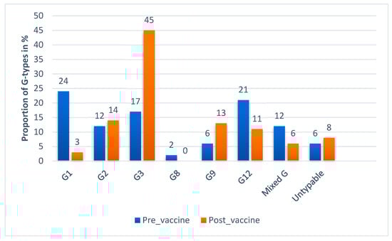 G-type distribution of rotavirus during pre- and post-vaccine introduction in Ethiopia 2010–2018.