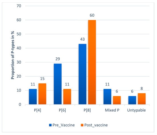 This review study also demonstrated P[8] (43%), P[6] (29%) and P[4] (11%) were the commonly identified P-types of rotavirus before the introduction of a rotavirus vaccine. Likewise the P[8] (60%), P[6] (11%) and P[4] (15%) remained the commonly identified P-types post-vaccine introduction with P[8] becoming more dominant than before (Figure 10).