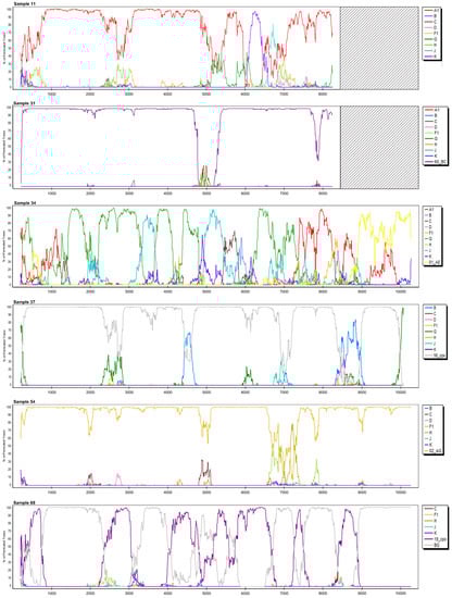 SimPlot bootscan analysis of the Slovenian near full-length HIV-1 genome sequences characterized as recombinants, where the x-axis represents the nucleotide position in the alignment.