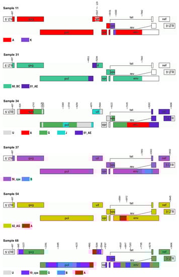 Final unique recombinant forms visualized with the Recombinant HIV-1 Drawing Tool, where recombination breakpoints are depicted according to nucleotide position in the reference HXB2.